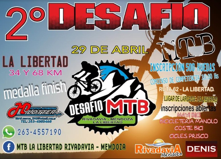 El próximo domingo 29 de abril desde las 10:00 se realizará en La Libertad el 2º Desafío MTB, dentro de los festejos por los “134º Aniversario de Rivadavia”