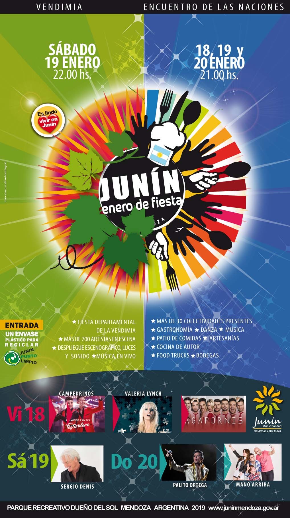 Aunque en anteriores ediciones era la Vendimia departamental la que abría los festejos en el Parque Recreativo, en esta ocasión, el Municipio de Junín decide invertir la oferta cultural: será el Encuentro de las Naciones el que reciba a vecinos, turistas y viajeros desde el viernes 18 de enero con una grilla de artistas de destacada trayectoria nacional: Valeria Lynch, Los Campedrinos y Agapornis.