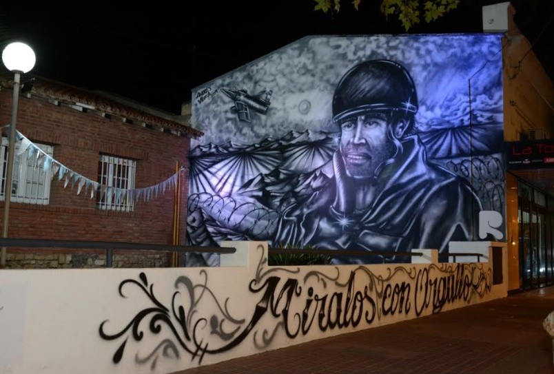 Los homenajes continuaron a la tarde noche con el descubrimiento de mural “Míralos con orgullo”, pintado en el patio delantero de la Esc. Bernardino Rivadavia, obra realizada por el artista Andrés Viera. el descubrimiento de la obra fue llevado a cabo por el Intendente Miguel Ángel Ronco junto con los ex combatientes ante el público presente, tanto en el establecimiento educativo como en calle San Isidro.