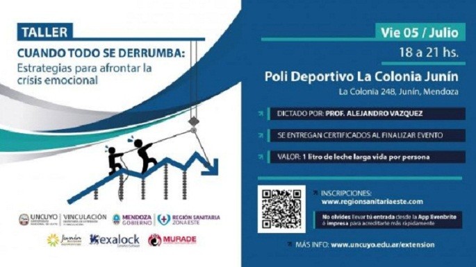Bajo el auspicio de la Municipalidad de Junín, el próximo viernes, de 18 a 21, en el Estadio Cubierto La Colonia, en La Colonia, se realizará el Taller Cuando todo se derrumba: estrategias para afrontar la crisis emocional, dictado por el profesor Alejandro Vázquez.