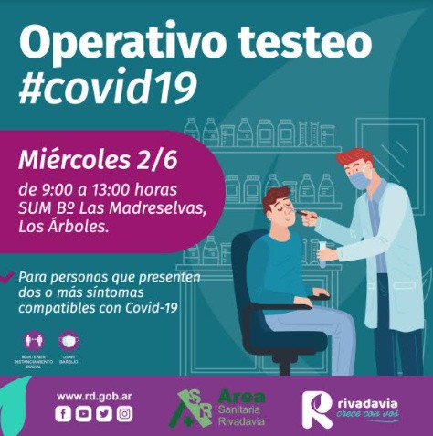 Organizado por la Municipalidad de Rivadavia y el Área Sanitaria departamental, el próximo lunes 31 de mayo y el miércoles 2 de junio se llevarán a cabo operativos de testeos, destinado a personas que presenten dos o más síntomas compatibles con Covid-19.