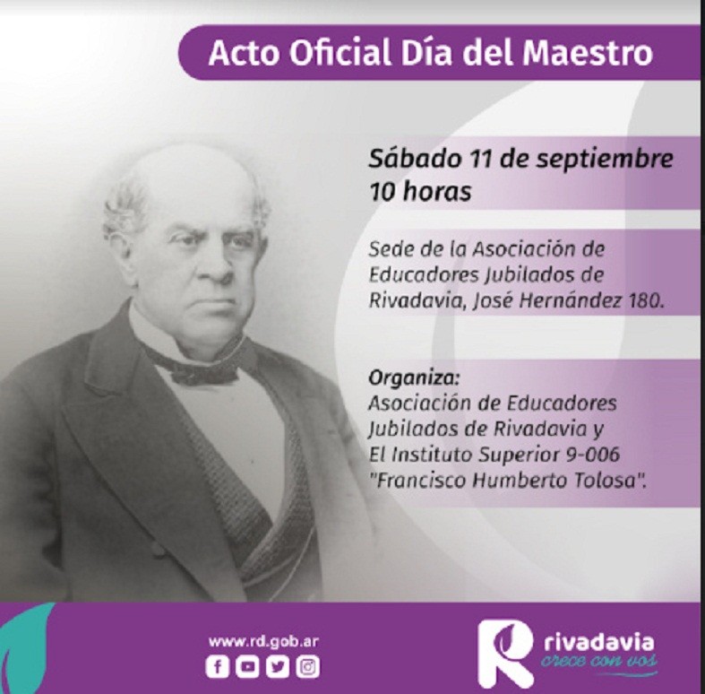 La Municipalidad de Rivadavia junto a la Asociación de Educadores Jubilados de Rivadavia y el Instituto de Educación Superior Nº 9-006 “Francisco Humberto Tolosa”, realizarán el próximo sábado 11 de septiembre, desde las 10 horas, un homenaje por el 133º Aniversario del fallecimiento de Domingo Faustino Sarmiento y “Día del Maestro”.