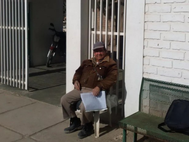 Rosauro González tiene 75 años y hace 25 años que es el encargado del cuidado y la mantención del cementerio de Las Catitas. Hoy decidió amarrarse a la puerta hasta que vea su salario depositado.