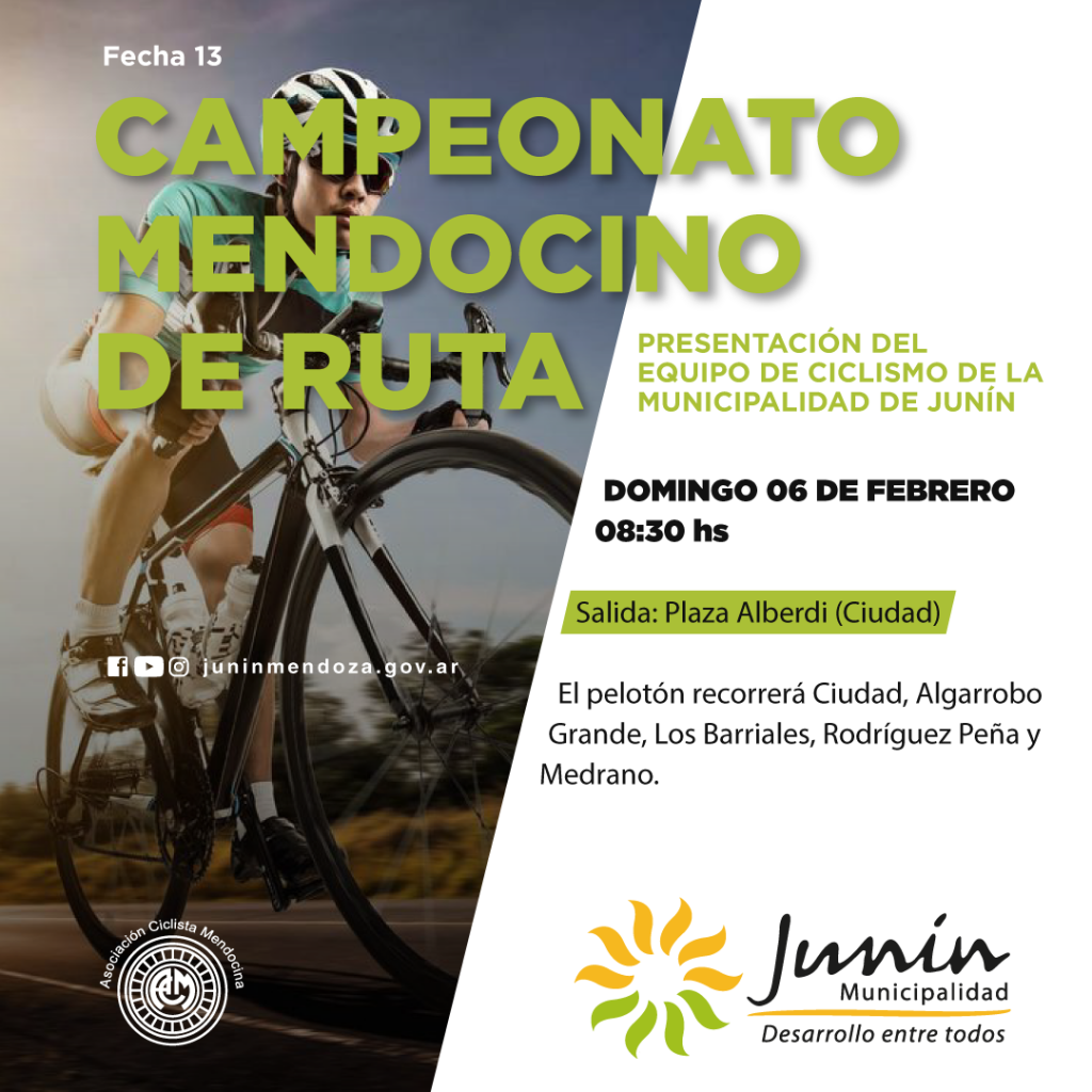 Este domingo 06 de febrero, desde las 08.30hs, se disputará la fecha nº 13 del Campeonato mendocino de ruta 2021/2022 en Junín, donde los ciclistas recorrerán tres vueltas de 48 kilómetros, atravesando las rutas de Ciudad, Algarrobo Grande, Los Barriales, Rodríguez Peña y Medrano.