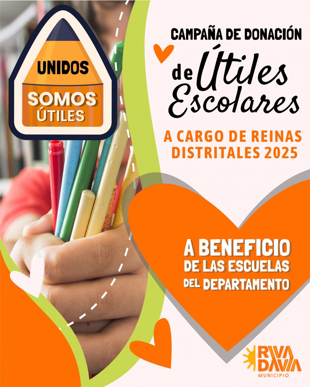 Comunicate al instagram de “Reinas Rivadavia 2025” para coordinar el retiro de útiles en los distritos.