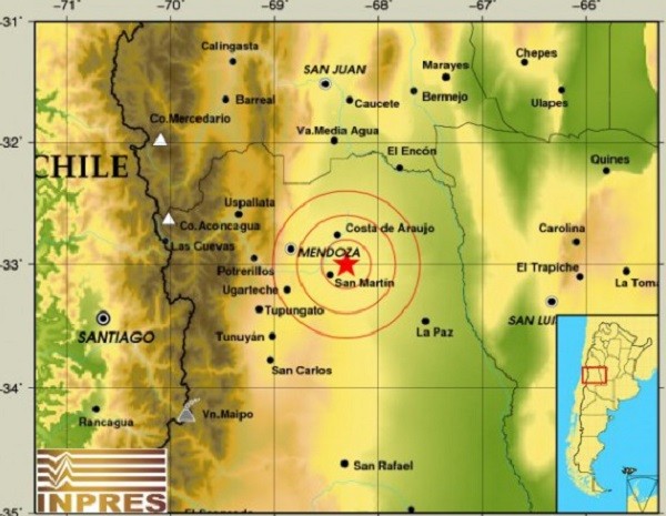 El epicentro, de acuerdo con los datos oficiales, fue a 52 kilómetros al este de Mendoza, a 166 kilómetros al sur de San Juan y a 17 kilómetros al noreste de San Martín.