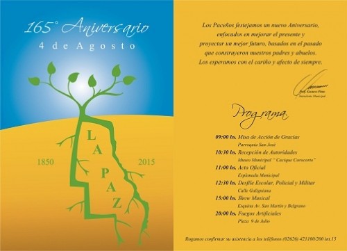 Pero, indudablemente, el plato fuerte de las actividades programadas se podrá disfrutar el martes 4, cuando La Paz cumpla sus 165 años de vida y para celebrarlos se ha dispuesto la realización de varias actividades, que se desarrollarán de acuerdo al siguiente cronograma: