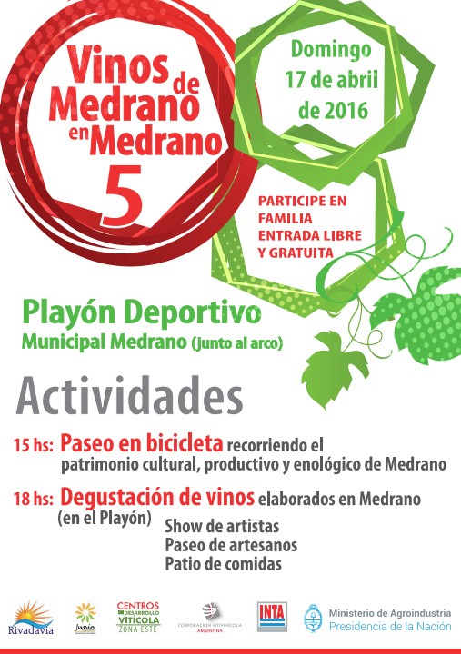 El próximo domingo 17 de abril, desde las 15 hs., en el playón deportivo de Medrano, se realizará la 5º edición del evento cultural Vinos de Medrano en Medrano, con la participación de reconocidas bodegas del departamento y la Zona Este.