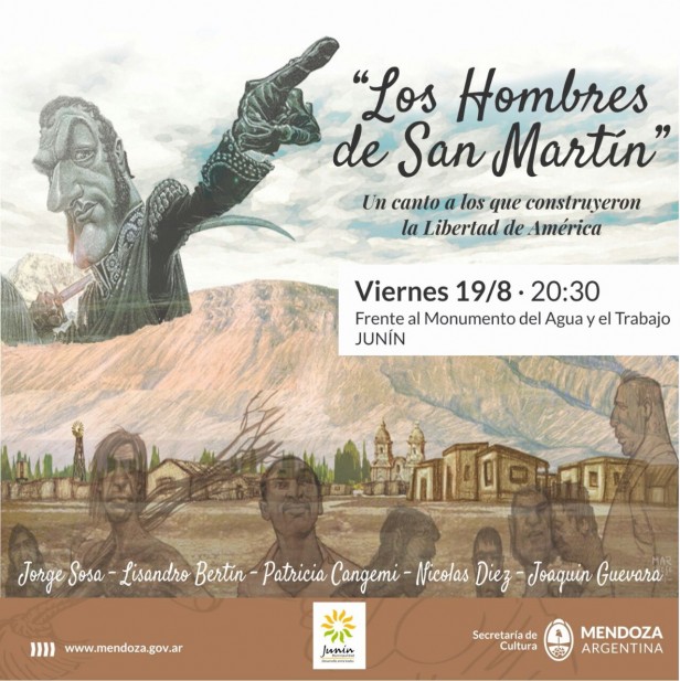 El próximo viernes, desde las 20.30, frente al Monumento al Agua y al Trabajo, en Los Barriales, se presentará el espectáculo Los hombres de San Martín, un canto a los que construyeron la Libertad de América, organizado por la Secretaría de Cultura de Mendoza y con el auspicio de la Municipalidad de Junín.