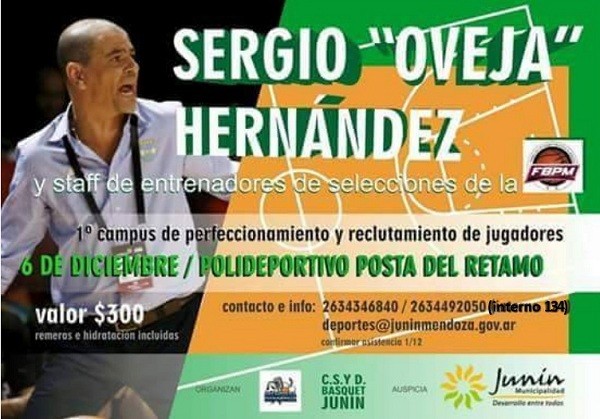 El próximo martes 6 de diciembre, desde las 9, organizado por la Comisión de Básquet del Club Junín, y bajo el auspicio de la Municipalidad de Junín, se desarrollará, en el Polideportivo Posta del Retamo, el 1º Campus de perfeccionamiento y reclutamiento de jugadores, con la participación de Sergio Oveja Hernández, entrenador de la Selección Nacional de Básquet, y un staff de entrenadores de selecciones de la Federación de Básquet de la provincia de Mendoza.