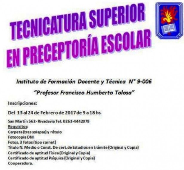 Se realizaran las inscripciones para la carrera de Tecnicatura Superior en Preceptoría Escolar a desarrollarse en el Instituto de Formación Docente y Técnica Nº 9-006 “Profesor Francisco Humberto Tolosa”, desde el día lunes 13 de febrero al 24 del corriente mes en horario de 9 a 18 horas, calle San Martín 562 del departamento de Rivadavia.