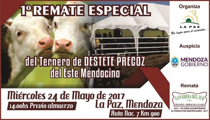 El miércoles 24 de mayo desde las 12:00 horas La Paz será el lugar elegido para que los productores ganaderos de la región puedan adquirir ejemplares seleccionados en el Gran Remate llamado “Primer Remate del Ternero Liviano del Este Mendocino” que se desarrollará en el Predio Ganadero Municipal ubicado sobre la Colectora Norte de la Ruta Nacional N° 7.