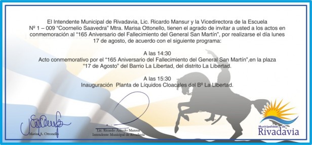 El Intendente Municipal de Rivadavia, Lic. Ricardo Mansur y la Vicedirectora de la Escuela Nº 1 – 009 “Coornelio Saavedra”, Mtra. Marisa Ottonello, tienen el agrado de invitar a la comunidad a los actos en conmemoración al “165 Aniversario del Fallecimiento del General San Martín”, por realizarse el día lunes 17 de agosto.