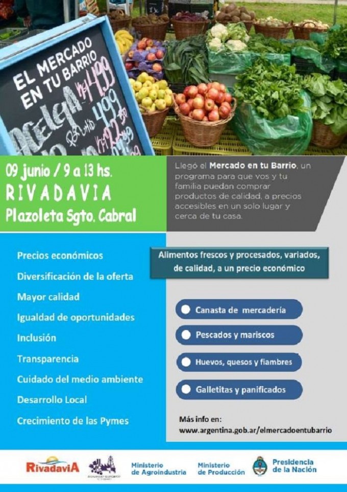 “El mercado en tu barrio” recorrerá todos los departamentos cuyos municipios hayan adherido. Los proveedores formarán parte de un circuito que rotará por semana y atenderá de 9 a 13. En esta oportunidad en nuestro departamento estará en la Plazoleta Sargento Cabral el próximo viernes 9 de junio.