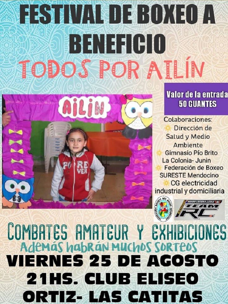 Este viernes, en el club Eliseo Ortíz de Las Catitas (calle Antonio Parra s/n), se realizará un festival de boxeo solidario a beneficio de Ailín Guiraldes, una niña de esa localidad que necesita dinero para una operación de columna luego de que le diagnosticaran esclerosis múltiple congénita.