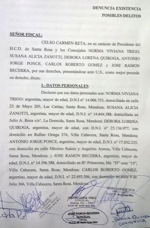 El Concejo Deliberante denunció en Fiscalía de Santa Rosa a Salgado, donde se lo acusa de presuntos delitos de peculado y asociación ilícita; similar denuncia a la que los ediles de la oposición incluido Roberto Gómez (FPV) hicieran en Fiscalía de Delitos Complejos. Esta vez la denuncia fue realizada por el Cuerpo y encabezada por el presidente del mismo en representación del Honorable Concejo Deliberante.